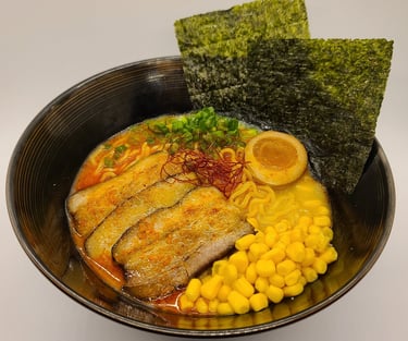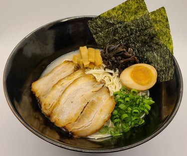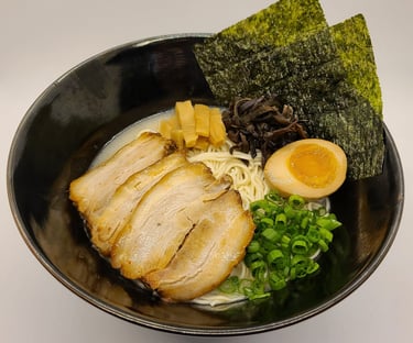 Tonkotsu Pork bone broth that has been simmered for many hours until it has a unique rich flavor of pork bone, which simmered pork bones until it is a creamy white soup and has a rich and mellow taste.